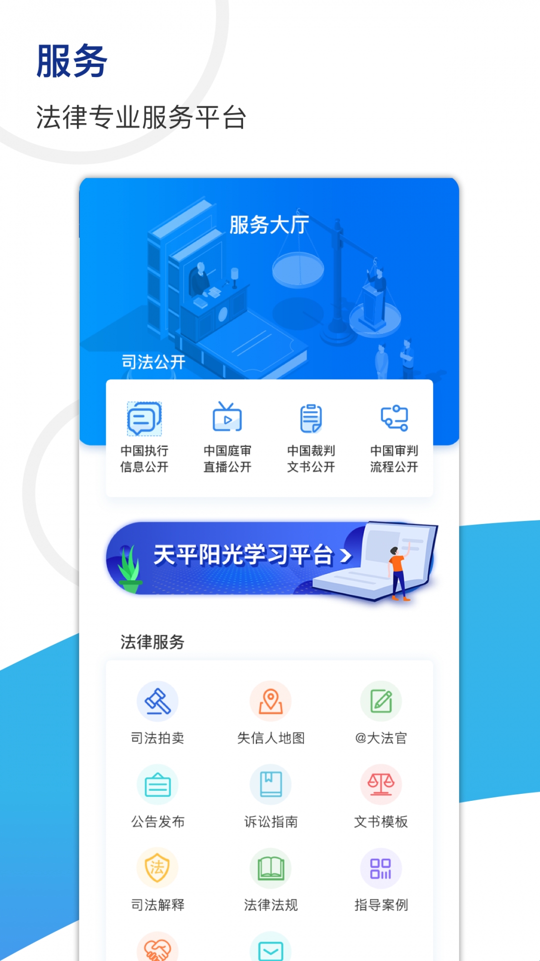 天平阳光一体化移动平台是一款专为日常生活设计的法律实用APP。它为你提供便捷的法律诉讼服务和专业法律援助,帮助你快速掌握最新法律资讯。
