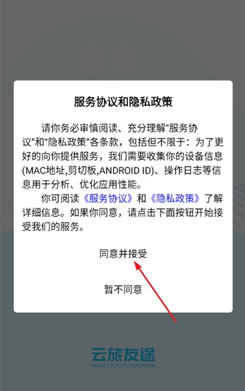 1、首先打开软件,阅读并同意《服务协议》和《隐私政策》;