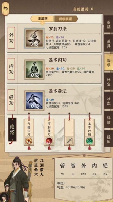 2、武功文化可以随便选。但俩专业必须一个雕塑一个工匠,施舍5两也是必须的(实际上雕塑这个也许不是必要选的,不过工匠最好开局就选,从头到尾收益都挺大的,具体后面会说到)。把包里江湖杂谈卖了,桌上钱收拾收拾,出门最低65两,准备起飞。此时开始默念——不要轻易消耗时间!