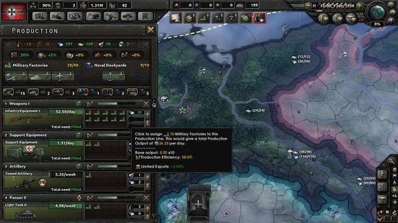 如同P社在开发日志中说的,你不可能集齐几百个工厂在一周内憋出一艘航母,每条生产线最多只有15个军用工厂投入生产。鼠标移动到工厂槽上就可以增加/减少这条生产线上的工厂了,同时还可以看到这条生产线每天能生产的装备,比如现在每天可以生产52.5单位的1级步兵装备和消耗的资源。
