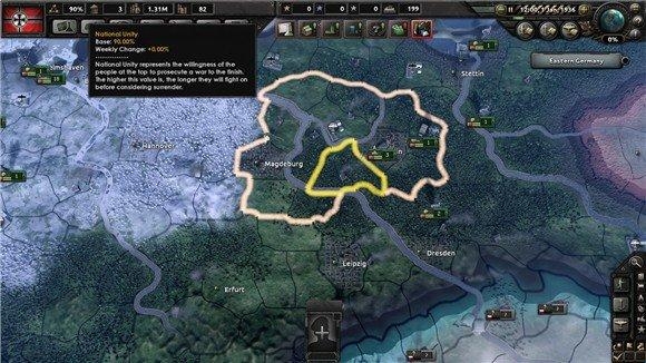 我们先来看游戏界面最上方的那一排数据,把鼠标移动到数据上方,会有提示框出现。最左上方的三只手图标,就是“国家凝聚力”。可以看到德国的凝聚力是90%