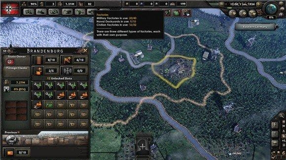 可以看到,勃兰登堡地区作为德国最繁华的的地区,解锁了12个工厂槽。在钢四中,一个地区可以建造的工厂数量与地形有关。比如勃兰登堡属于城市,可以建造12个工厂(大都会貌似可以建造25个,暂时不知道怎么把城市升级成大都会),而平原、丘陵等地形肯定会有所减少,具体可以参考钢四开发日志。