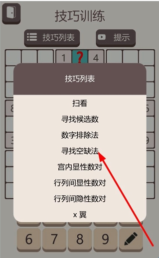 4、打开技巧学习,对于不太会玩的玩家来说可以先学习技巧,点击技巧列表可以查看数独技巧,还有提示可以参考。