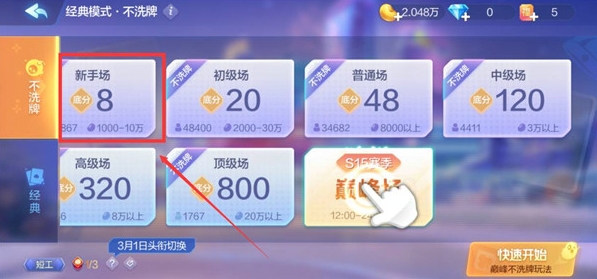 2、包括新手场、初级场、普通场、中级场、高级场、顶级场和巅峰场,我们可以根据自己的欢乐豆多少来选择场次,以【新手场】为例,