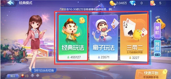 1、打开欢乐斗地主云游戏,包括经典玩法、癞子玩法和三带二等游戏模式,玩家可自行选择,这里以【经典玩法】为例,