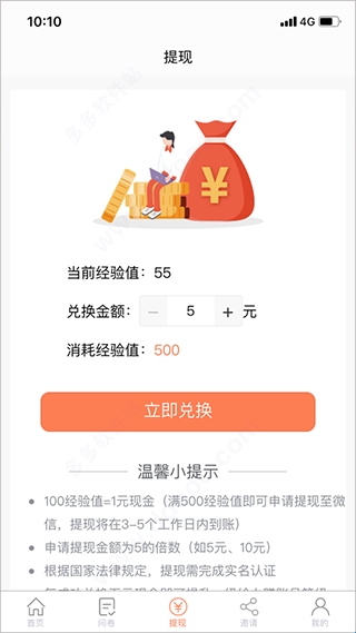 2、将经验值兑换成现金,通过提现中心的兑换功能把自己的经验值兑换成现金;