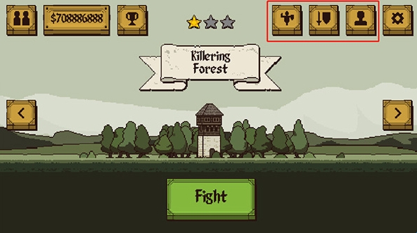 2、点击中间“Fight”即可开始游戏,上方从左到右依次为训练场、武器、人物;