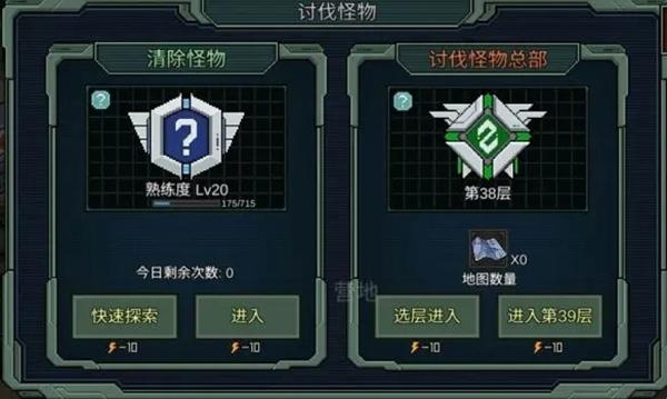 清除怪物&怪物总部。清除怪物是一个怪物密集的图,每天三次,建议开双倍卡进去打经验多多,怪物总部地图在清除怪物里获得,每天三张,如果打不过可以存着。升级装置可以加强在总部的属性抗性等。这个图还是挺重要的,后期难度也随着提高,不过新手到那时候已经是老手了,应该能解决;
