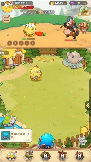3、点击上方的冒险按钮可以派遣小鸡去闯关,小鸡会自动攻击敌人来完成挑战。