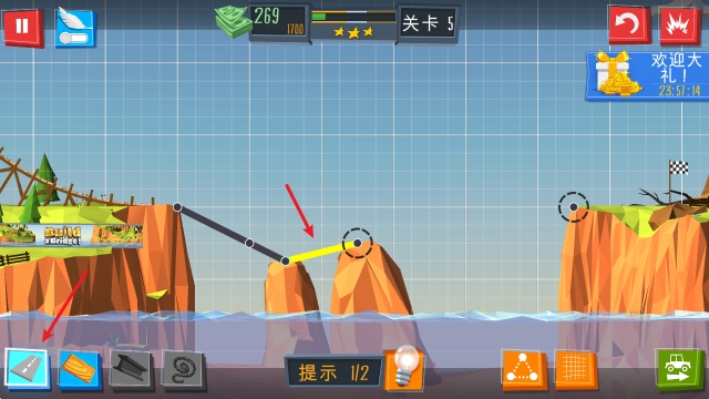 核心玩法在于精准预算管理:材料使用越少,桥梁越高效,你的得分就越高!解锁多样化的建筑道具,如柔韧钢缆、轻质合金和特殊支撑结构,每种道具都能带来惊喜效果,让你的设计充满创意与可能。