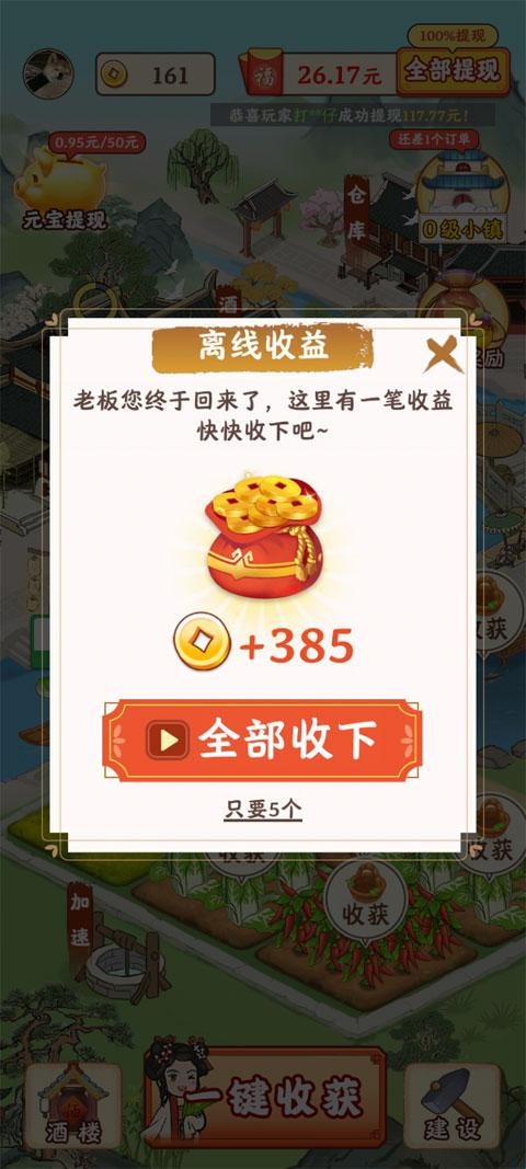1、进入江南小镇红包赚钱版游戏,离线收益可以获得金币