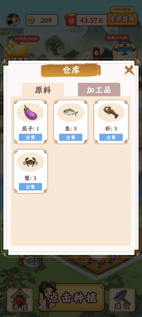 10、仓库中有多余的原料也可以进行出售,然后可以获得金币