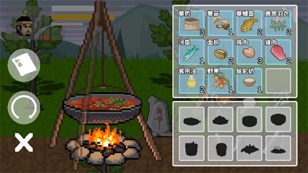 4、击败敌人后会掉落各种各样的食材,前往火堆可以消耗不同的食材来制作各种各样的料理,这些料理会为赵大提供各种增益效果。