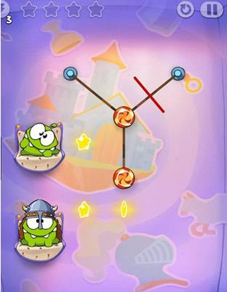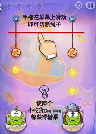 第四关:左边的糖果先切竖直的线,吃到星星后就切断最左边的线。右边的绳子同理。