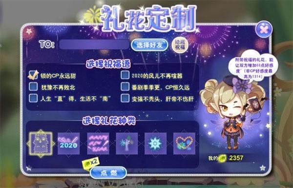3、礼花定制。消耗神叶进行礼花定制,将他送给你的好友们,不仅有特殊的通知,同时还可增加双方的好感度哦!