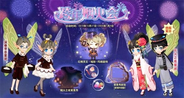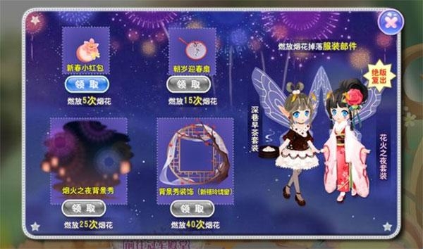 参加活动可获得深巷早茶套装、花火之夜套装(绝版复出)、暗影花精灵王?玛格丽特、烟火之夜背景秀、背景秀装饰:新禧玲珑窗。