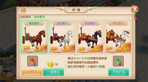 押镖、秘境,铜钱主要产出的地方,每天18点到19点是双倍时间,由于劫镖的收益也很可观,每天也可以自己开小号来劫,自己护送的时候小心,如果实力不济,可以选择人少的时候护送。