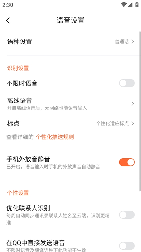 5、在语音设置中,用户可以对语种进行更换,可以对识别、个性化等进行设置。