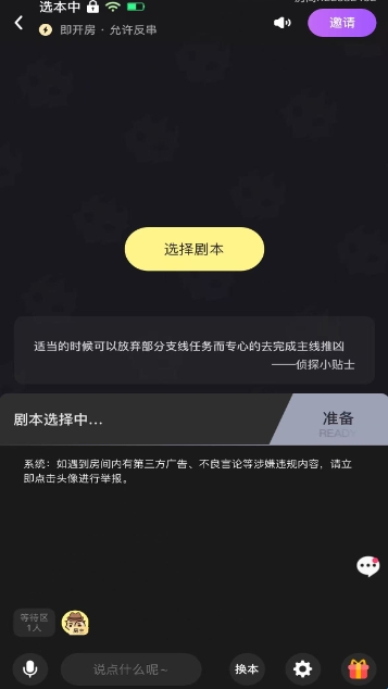 百变大侦探最新版是一个融合了狼人杀和侦探游戏的社交互动平台,你可以选择对手然后一起在平台上展开游戏,也可选择自己喜欢的剧本来和你的小伙伴们一起游戏,是时候展现你的逻辑思维能力了!