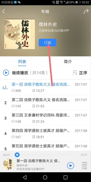 3、进入小说详情页面后,选择小说目录中的选集直接点击即可在线听书。如果对这小说感兴趣还可点击【订阅】(下图红色箭头所指区域)对这小说进行免费订阅,