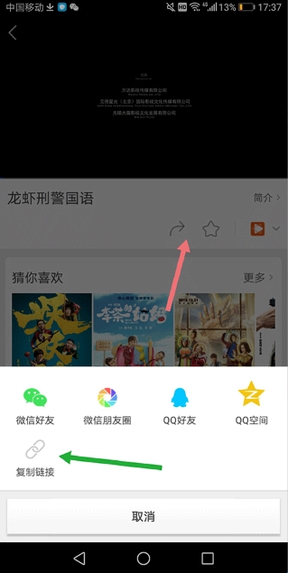 3、播放的视频如果没有提供下载渠道,例如下图页面中找不到下载渠道,用户可以通过点击其提供的分享按钮(下图红色箭头所指区域),在底部弹出的选项中点击【复制链接】(下图绿色箭头所指区域)复制其链接地址到手机浏览器中进行下载。