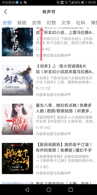 2、选择一本自己想看的小说,可以切换顶部导航栏(下图红色箭头所指区域)进行分类查找