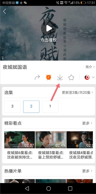 1、在播放的视频下方找到向下的下载箭头,点击下载按钮(下图红色箭头所指区域);