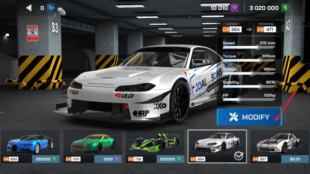 1、主界面中点击CARS进入车库,找到喜欢的汽车购买,然后点击MODIFY。