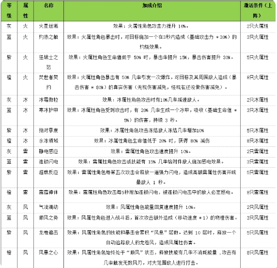 上阵同属性角色,会激活属性加成,上阵同属星角色越多,属性加成等级越高。
