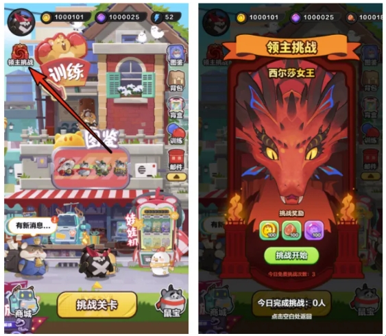 点击开始挑战,参与领主挑战任务,每个玩家每日有三次免费挑战机会,挑战成功则领取挑战奖励。