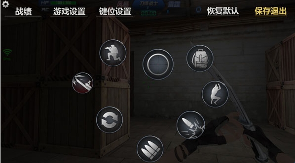 游戏画面左下角有一个圆圈状的虚拟按钮,右下角有个未显示的虚拟按钮,玩家通过滑动虚拟按钮控制人物的动作。其中左下角的虚拟按钮控制移动右下角的虚拟按钮控制准星和射击。同时,在画面左上角设置按钮中有战绩查询、游戏设置、键位设置功能,左下角有蹲下按钮,画面右侧分布有跳跃、切换武器、换子弹、扔手雷等按钮。