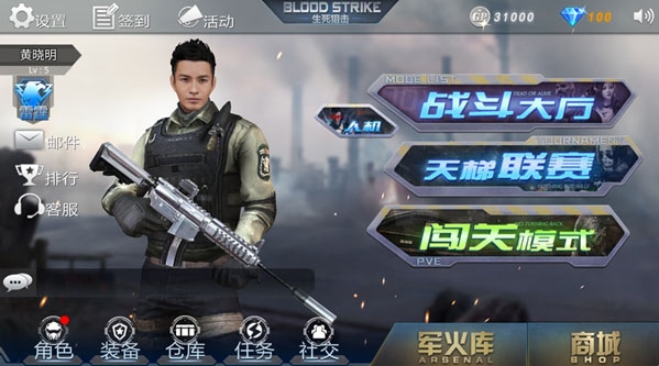 主界面最显眼的位置是玩家当前的游戏角色,占据画面的大部分,其次是位于角色右侧的战斗选择,包括战斗大厅、天梯联赛、闯关模式等选项。游戏系统被分布在了画面的左侧与下方。左上角是签到与公告栏。左侧与左下角是玩家的个人信息,背包仓库与交互系统,在这里可以查看个人数据,整理装备,添加好友、收发邮件等。右下角是军火库和商城的消费场所。总体来说,整个界面布局层次分明、井井有条,让玩家能够一目了然。