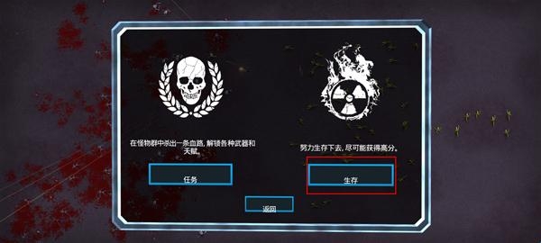 1、打开血腥大地手机版,点击开始,选择生存模式;