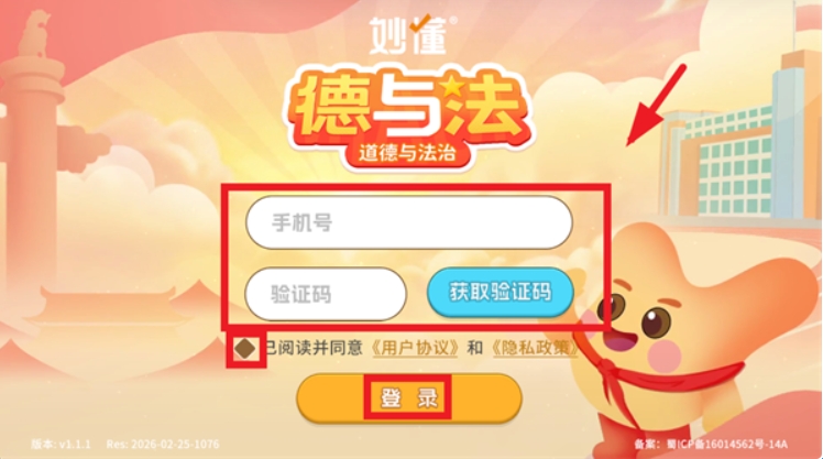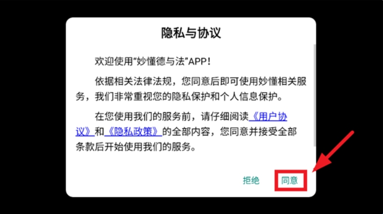 1、下载安装并打开妙懂德与法app,先同意隐私与协议