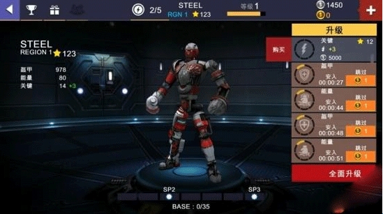 1、玩家可以拥有多个战斗机器人,但第一个机器人当然是《铁甲钢拳》里的主角——亚当。在进入正式战斗前,我们要先简单升级一下装备。装备升级完毕,开始职业战斗!