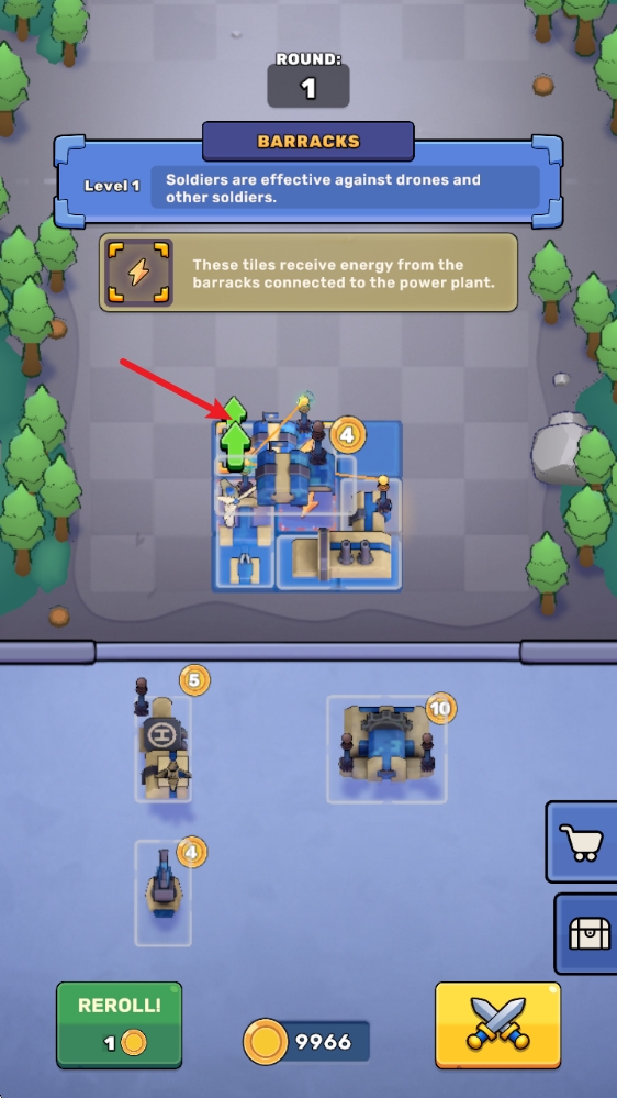 1、开局后,我们拖动建筑到格子中,需要通过连接来获得拥有电力的格子,在上面布置战斗单位。