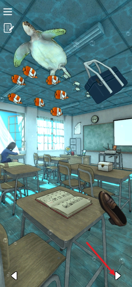 1、进入游戏后,我们会来到如海洋馆一般的教室内,点击下方箭头来切换不同的房间。