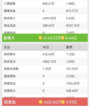 2、一级联赛:1级联赛依然是活人不多,赢球压力不大,这个时候如果想搭建八保三的阵容,就是要开启首冲的支持者,研究买人的时机了。重点来了!找到1联工资和门票的最佳平衡点。这个联赛等级建议大家工资保持在80万比较合适,80万工资,球馆等级差不多30级左右,联赛门票每日大约是140万左右,商业每日70万左右,加上杯赛城市赛,到赛季末,此联赛应该能攒1600万,加上冠军奖金,总计应该攒1800万左右。