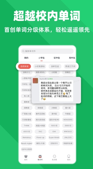 1、拓词APP拥有海量词库,其中包括KET核心词和A2级词汇,进入剑桥英语能力体系。