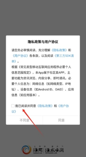 1、在本站下载安装淮水安澜app,进入后阅读并同意淮水安澜的用户协议