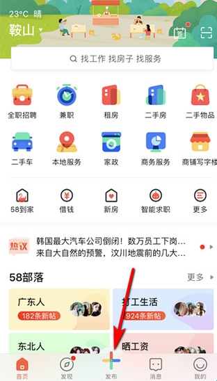 1、打开58同城app,进入首页,点击下方“+”发布按钮,如下图所示: