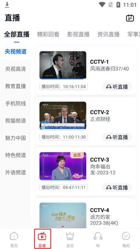 2、进入直播栏目后,我们可以看到有各种类型的直播,如影视、资讯、军事等等,同时,还提供精彩回放功能,我们点击进入;