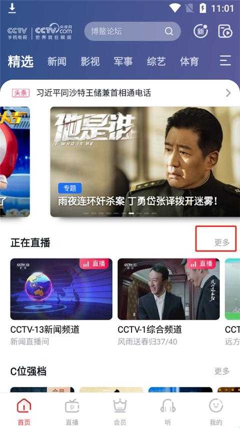 3、当然,用户也可以返回首页,点击直播栏目,它为用户提供了详细的直播分类,如影视、资讯、军事、体育、纪实等等直播类型;