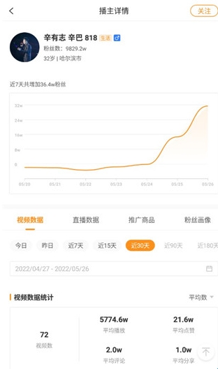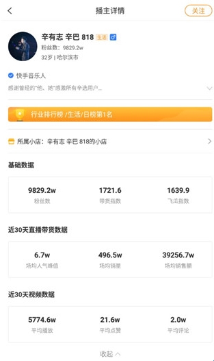 3、以直播带货播主【辛巴】为例,选择他的头像点击进入,可以看到他近30天的直播。场均销量达到496.5w,平均点赞21.6w。