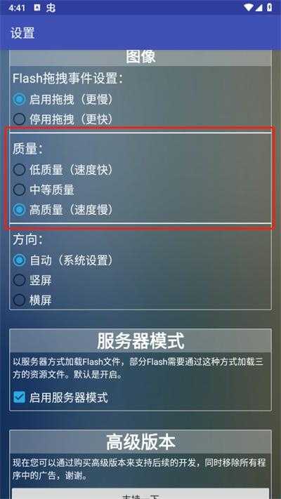 1、在设置中使用低画质可以提升Flash运行的速度。