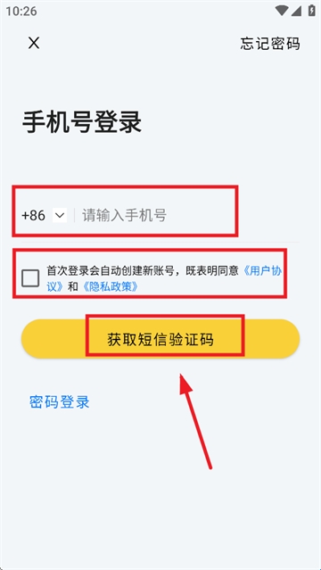 4、输入手机号,勾选首次登录会自动创建新账号,既表明同意 《用户协议》和《隐私政策》,点击获取获取短信验证码,使用验证码即可注册登录爱航阅读