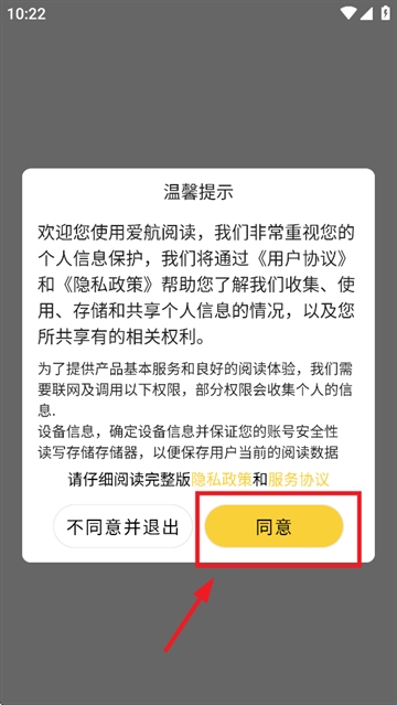 1、下载安装并打开爱航阅读app,先同意温馨提示