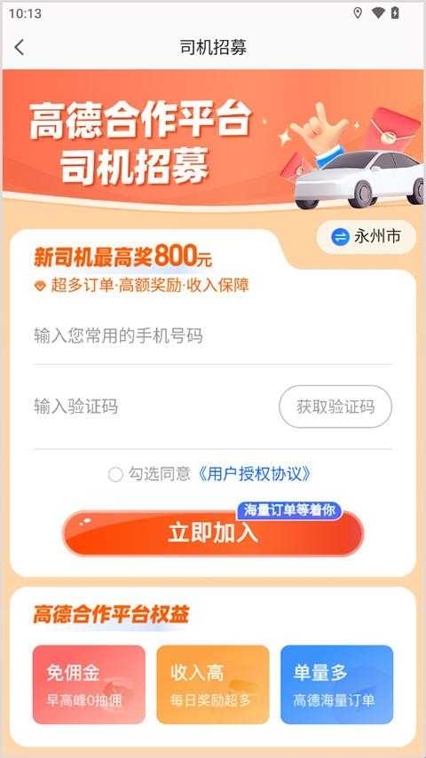 3、接着就会打开【司机招募】页面,在该页面下输入手机号和验证码,并勾选同意协议后点击【立即加入】