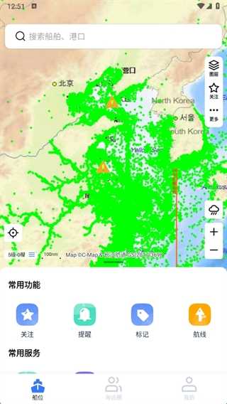 2、打开定位功能可以看到实时的船位信息,还可以直接搜索船舶和港口查看实时位置。