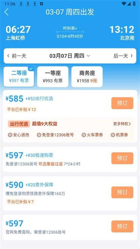 3、然后在具体票次内选择并点击“预订”的选项,即可预订。